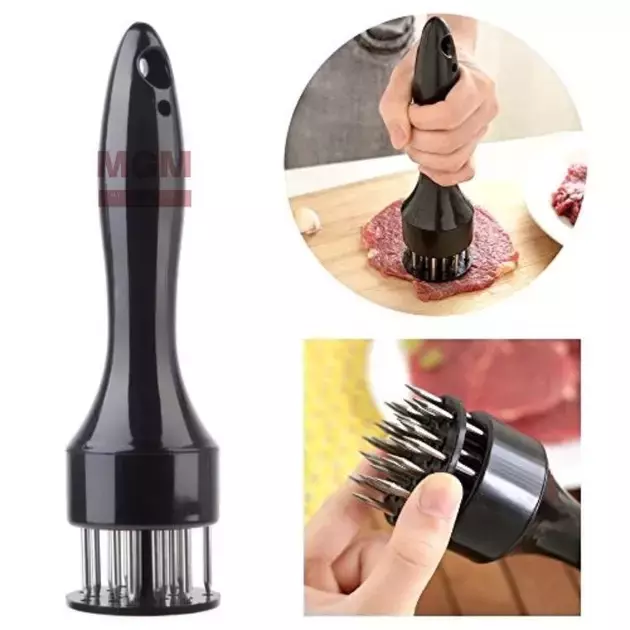 Ручка приладу виготовлена з якісного пластику, а голка з нержавіючої сталі. Усього прилад має 21 голку. Принцип роботи тендерайзер дуже простий. При постукуванні м'ясом 21 голка зробить безліч мініатюрних отворів у шматочку м'яса. На відміну від молотка, цей прилад не висушить м'ясо і воно залишиться соковитим. Крім того, він набагато зручніший за звичайний молот. Також Ви не розбудите з ранку своїх домашніх, роблячи відбивні, адже тендерайзер працює безшумно та без бризок. А ще обробка м'яса у такий спосіб скорочує час маринування на 80%, а смаження на 50%.